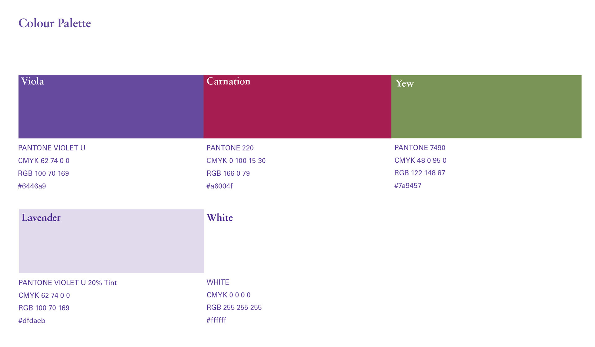 The colour palette uses colours from the Chelsea Physic Garden identity and adds a violet to help signify a unique strand of programming in A Dash of Lavender. When tinted, the violet is used as lavender.