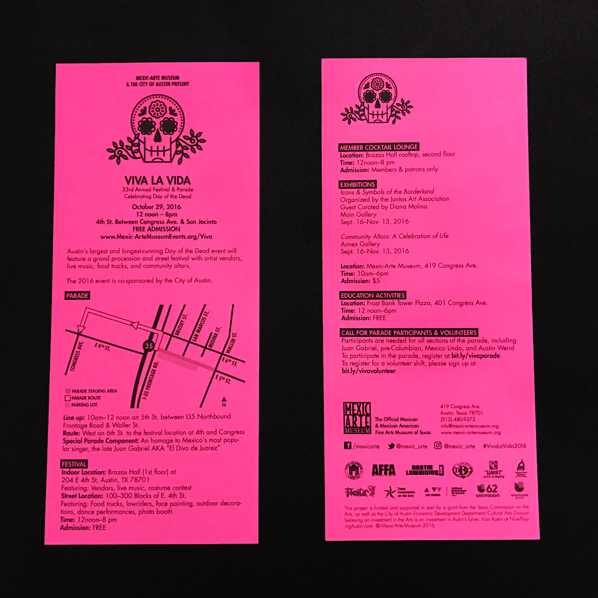 The annual Viva la Vida festival is Austin’s largest and longest-running Day of the Dead event, featuring a parade, artwork, entertainment, an exhibition inside the museum, and educational programs. Attendees enjoy traditional foods, interactive art activities, artist demos, and multidisciplinary performances. The festival and parade has been held for over thirty years. Zavala revised the identity of the event during his tenure as Visual Communicator at the Museum. The rebrand aimed to revitalize the identity of the festival as a modern, fun, artistic, and culturally relevant affair.